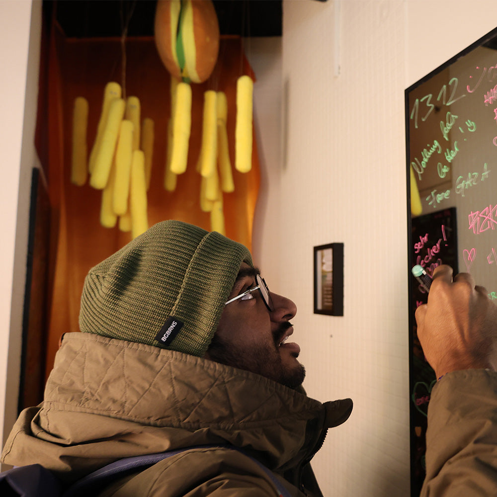 Erlebe die Elemente mit unserer grünen Oversize-Beanie, speziell entworfen für die unberechenbaren Tage des Wetters. Der dichte Stoff hält dich auch an stürmischen Tagen kuschelig warm. Damit wird sie zum unverzichtbaren Accessoire für regnerische Tage und wechselnde Wetterbedingungen.